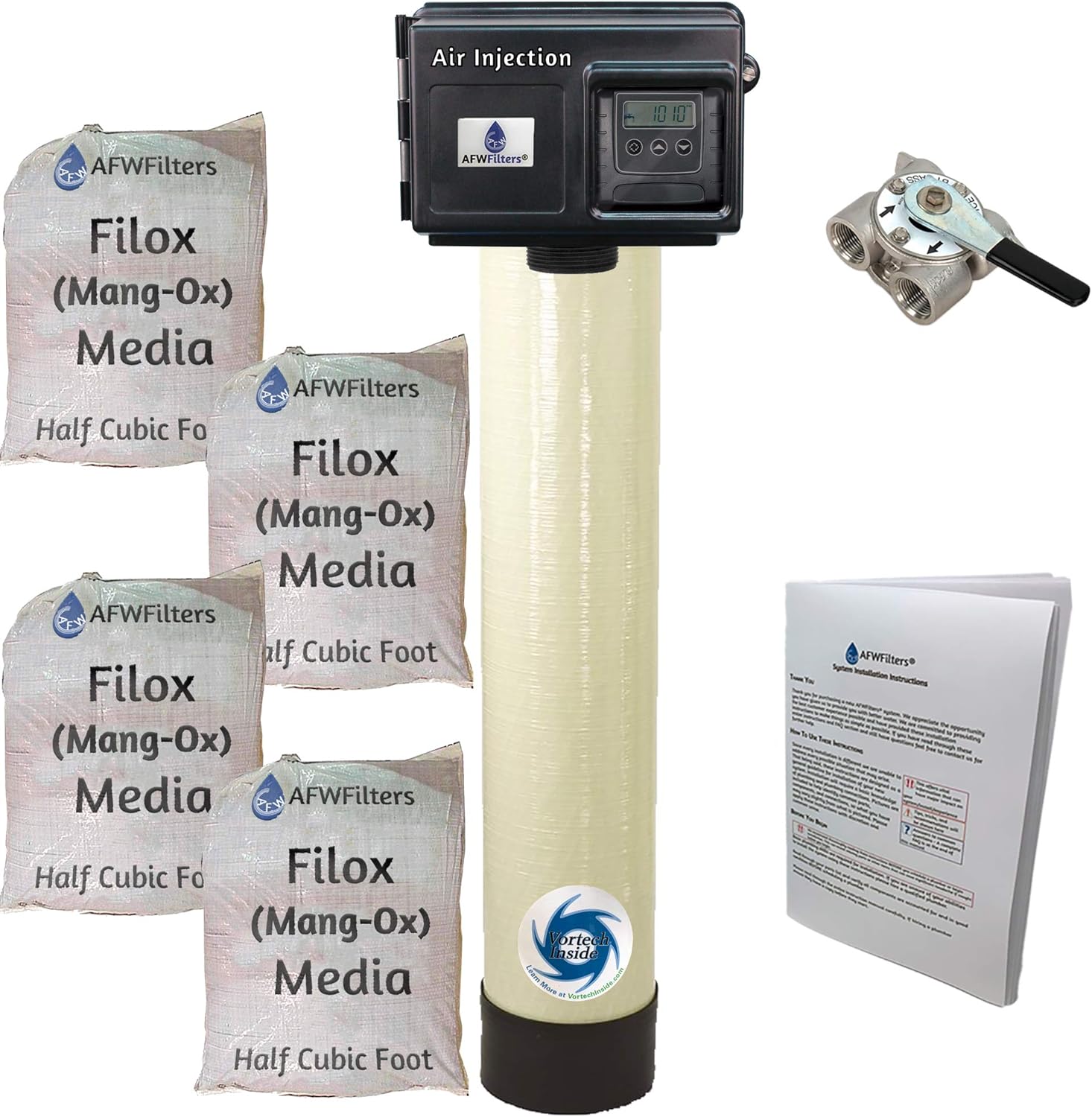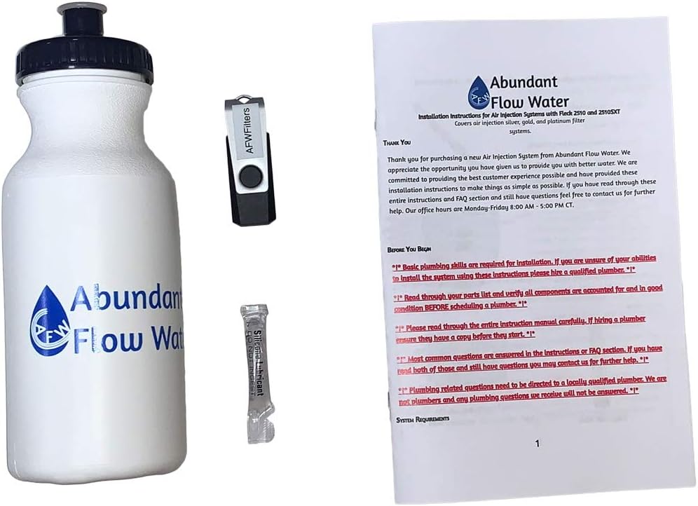 The advanced air injection design allows for air injection in a single tank, which is a significant advantage over two tank or venturi (inline) injection systems. By containing the oxidation process to a single tank routine maintenance is reduced, part replacement and associated costs are decreased, and less space is required. Instructions from AFW Filters on USB and free water bottle from AFW Filters