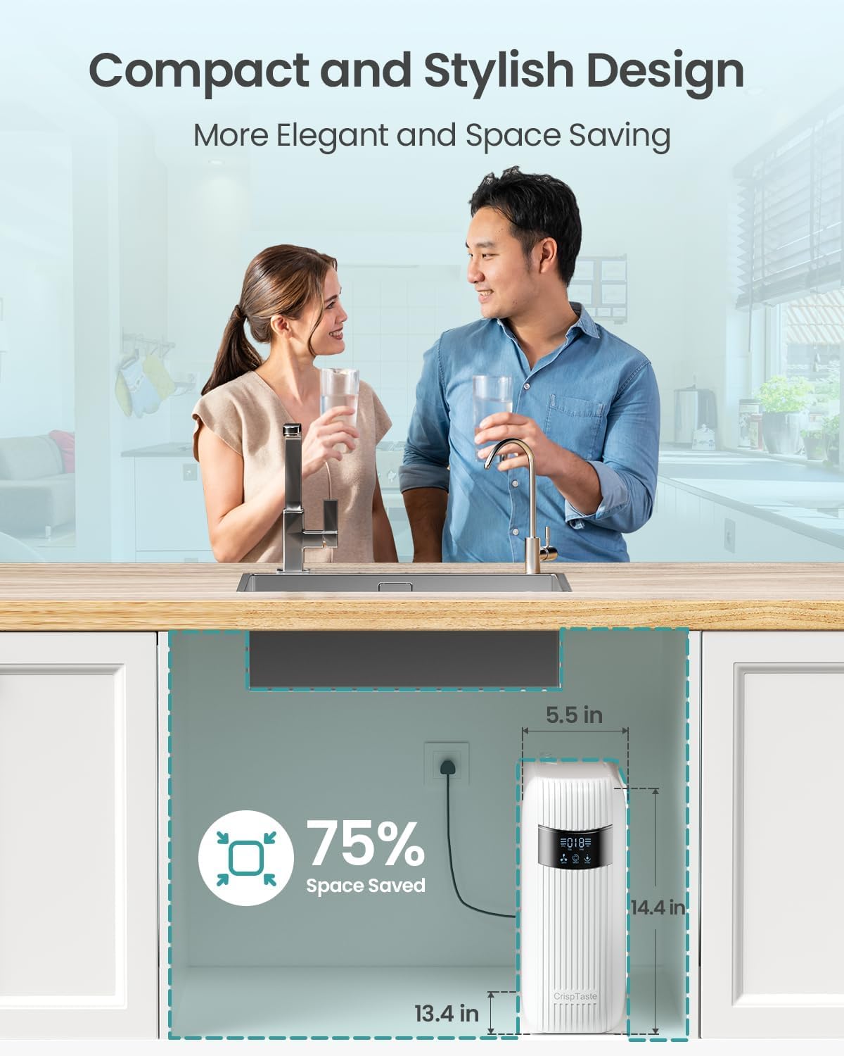 - [Space-Saving Tankless Design]: Compared to traditional ro water filtration system with tank, tankless ro water filter system offers a sleek, Measuring just 14.4" x 5.5" x 13.4", compact design that saves over 75% of under-sink space and prevents recontamination. Perfect for American kitchens. it’s easy to install in just 30 minutes. Upgrade your kitchen with a more efficient and stylish water purification solution