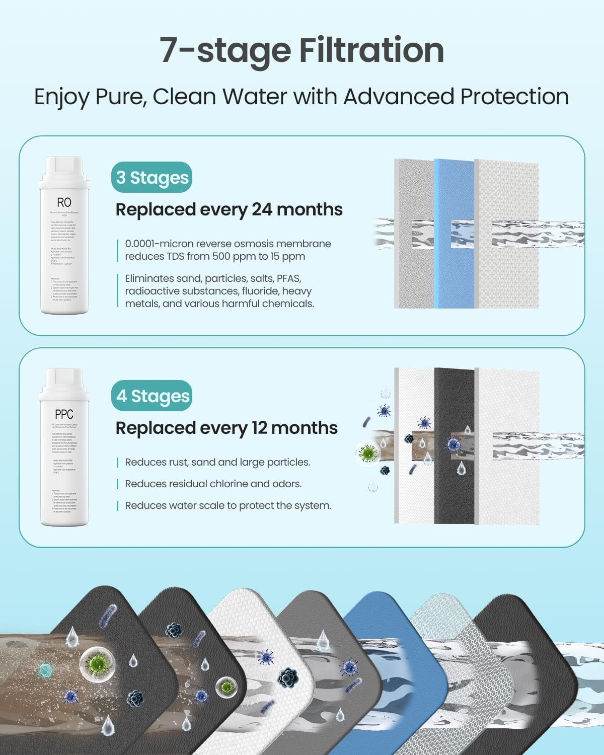- [7-Stage Comprehensive Filtration]: The tankless reverse osmosis system under sink features a 7-stage filtration process that removes over 1,000 contaminants, significantly improving your water's taste. The RO filter (3 stages) and PAC filter (4 stages) use a 0.0001-micron reverse osmosis membrane to reduce TDS from 500 ppm to 15 ppm, effectively eliminating sand, particles, salts, Chlorine, PFAS, radioactive substances(Radium), fluoride, heavy metals, odors and various harmful chemicals.
