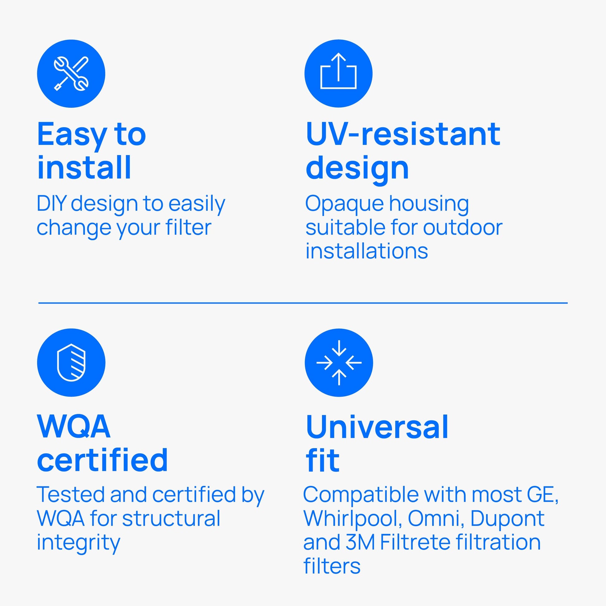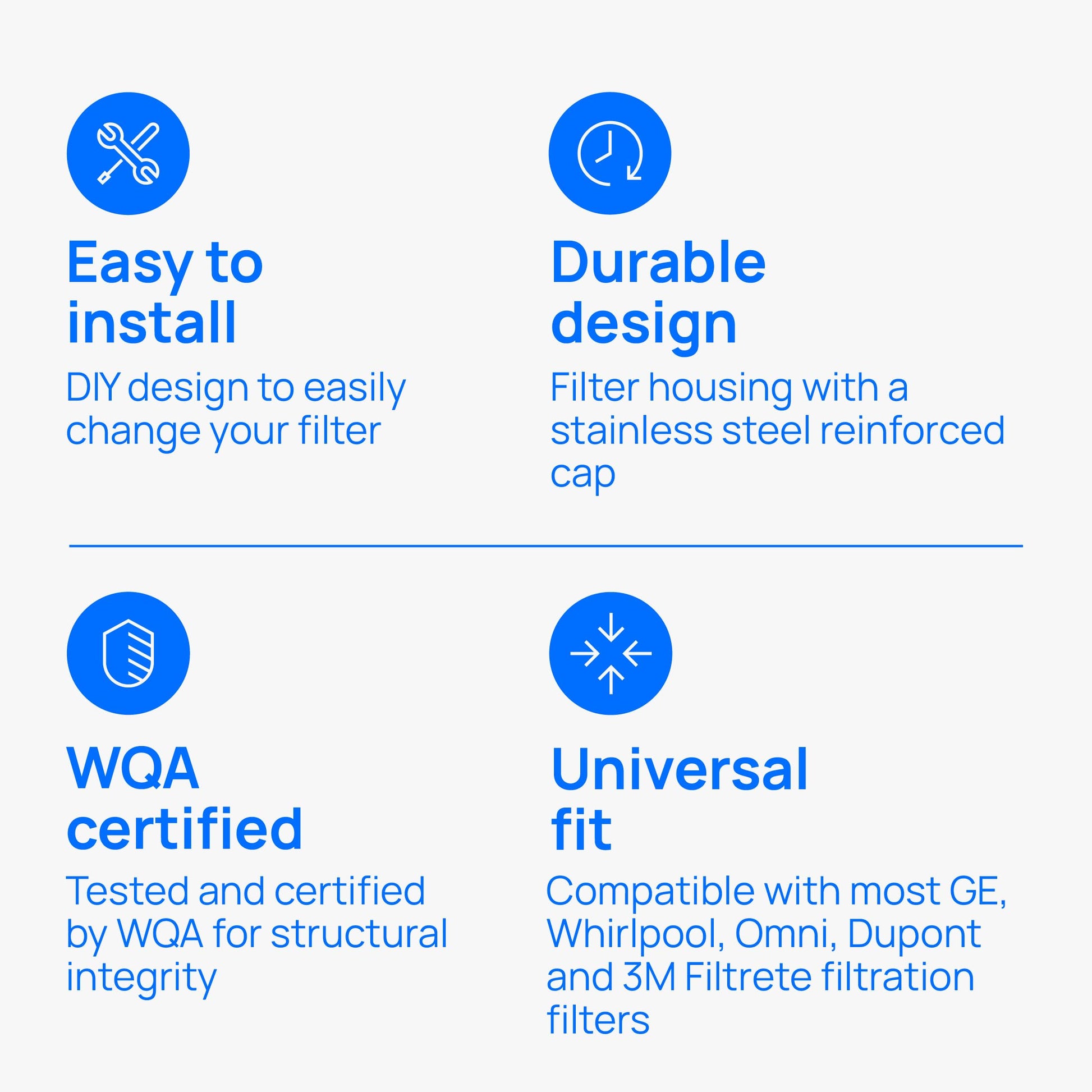 - Easy to Install: Featuring valve-in-head bypass shut-off for easy cartridge change, filter life timer, and stainless steel re-inforced 3/4" inlet/out and housing rim, system includes: P5 cartridge, mounting bracket, and housing wrench