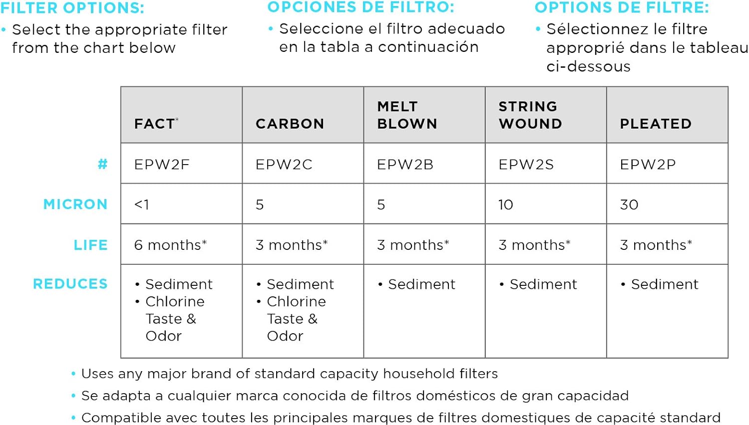 - Universal Fit - Uses EcoPure household filters EPW2F, EPW2C, EPW2B, EPW2S, EPW2P or most major brands of standard capacity filters such as: Whirlpool, Omni, Culligan, Watts, Filtrete, 3M, GE, and DuPont