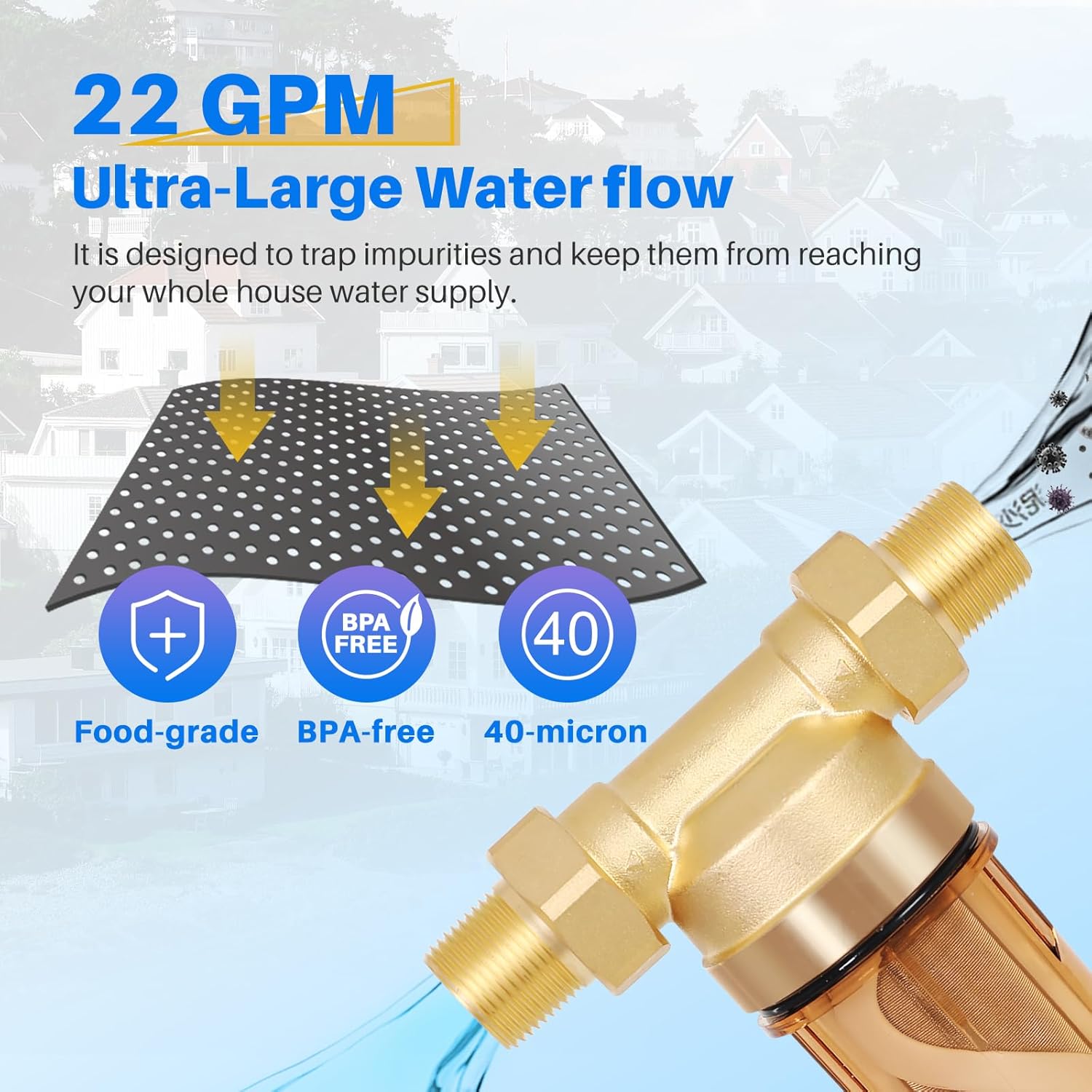 - The 40-micron pore size filter effectively removes particulates, sediment, rust, and other impurities from your home's water supply