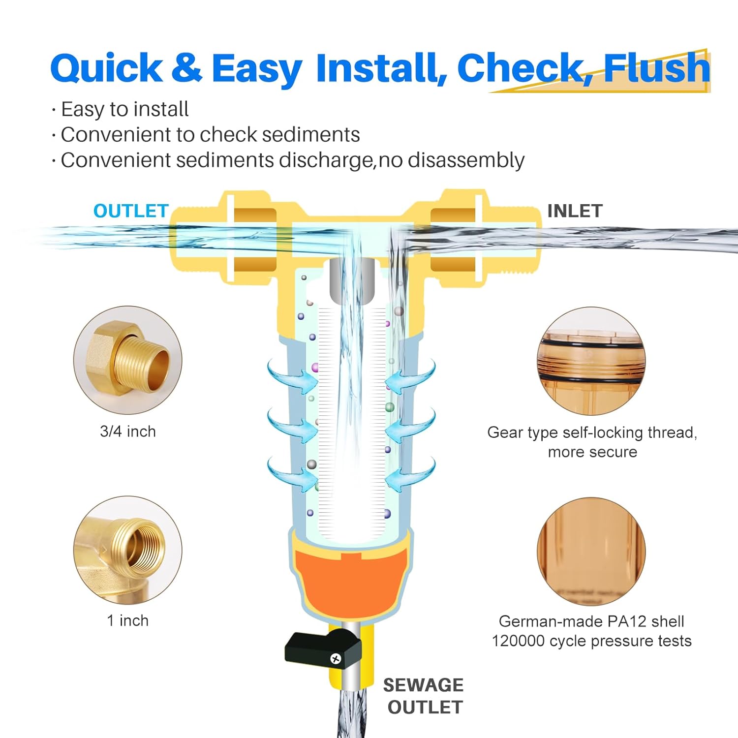 - Versatile Installation: Designed with 1-inch MNPT and 3/4-inch FNPT fittings on both ends, this filter accommodates a variety of threaded connectors. You can choose the appropriate installation method based on the size of your home piping.
