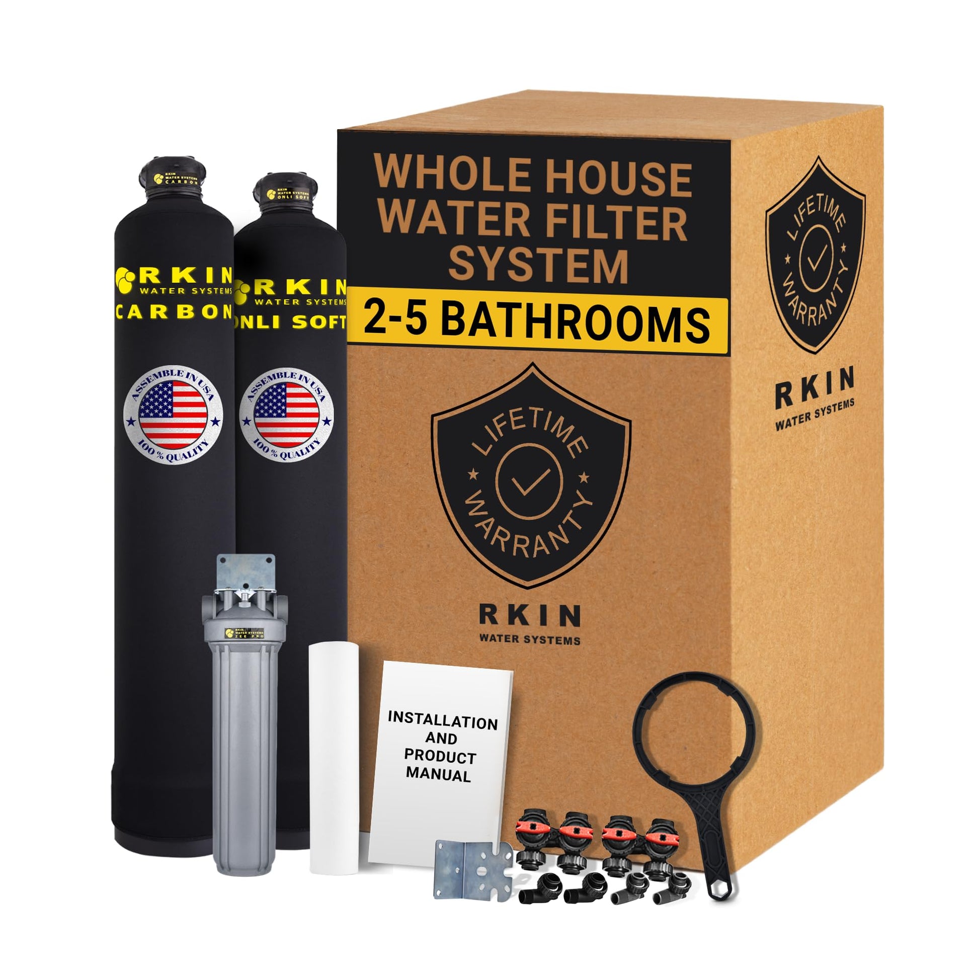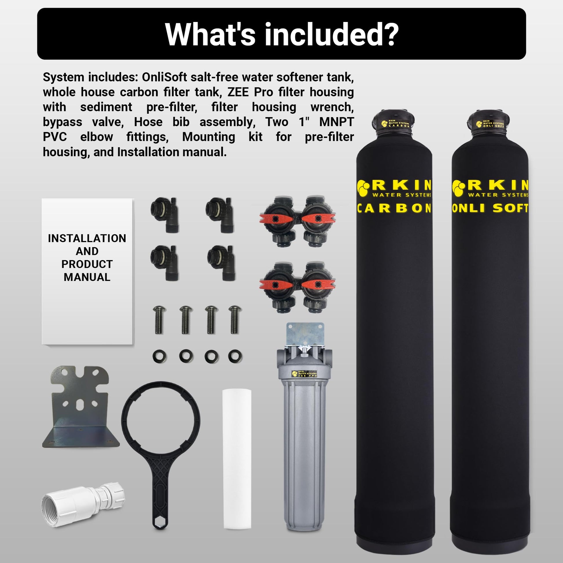 - Comes with everything needed for installation: Bypass Valves, 1" MNPT Elbow Fittings, Zee Pro Filter, Mounting Kit and Wrench for ZEE Pro Filter, Hose Bib Assembly, and etc.