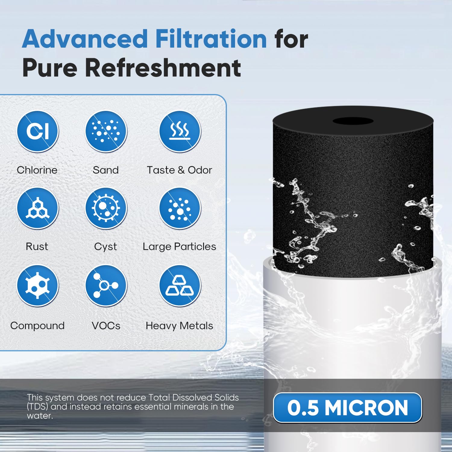 - š”š¦š šš²šæšš¶š³š¶š²š± šµšµ% šš³š³š¶š°š¶š²š»š šš¶š¹ššæš®šš¶š¼š» - PUREPLUS undersink water filter is certified against NSF/ANSI 42, adopts 6 in 1 special composite filter. With a filtration accuracy of up to 0.5 microns, it effectively filtering 99% of chlorine & odor, removing heavy metals, sediment and other large particles, significantly improving water taste.