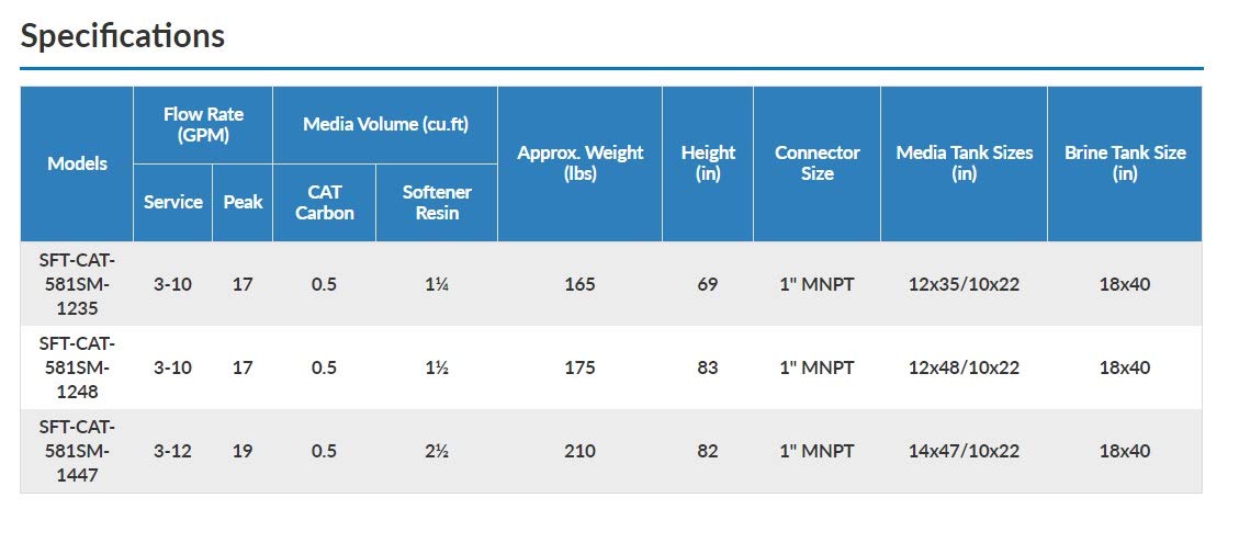 - Cation Resin and Catalytic Carbon Media: The softener resin reduces water hardness and prevents scale build-up, while the catalytic carbon media reduces chlorine, chloramine, benzene, hydrogen sulfide, heavy metals and other contaminants